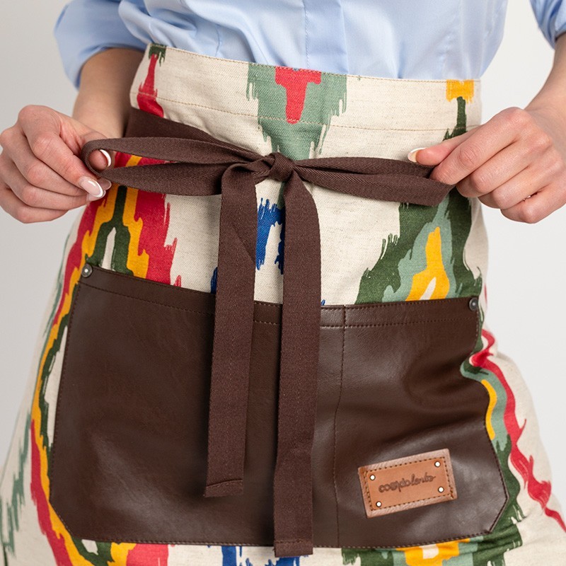this waist apron with leather pocket is ideal for hospitality professionals looking for a personalised and elegant image. Its innovative design with mallorcan-style tongue print gives it a modern and original touch, making it perfect for both dining and kitchen use. Made with high-quality materials, it guarantees durability and style.