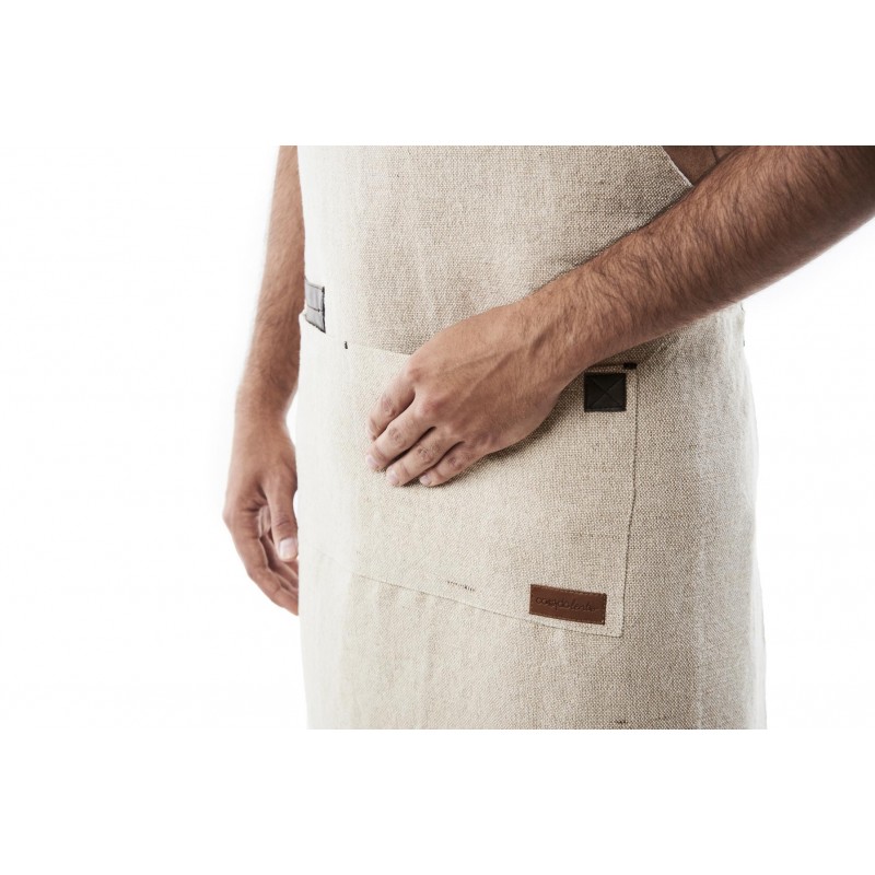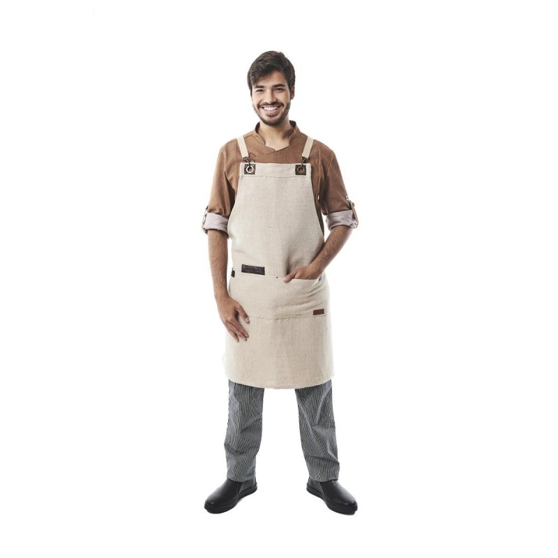 this natural jute fibre apron with faux leather applications is ideal for hospitality professionals looking for a practical and comfortable uniform. Its bib design with 2 large pockets, including one interior pocket, facilitates access to tools and utensils. The adjustable crossed straps on the back with cotton herringbone tapes offer a customizable fit for prolonged use, making it a highly appreciated professional chef's apron.