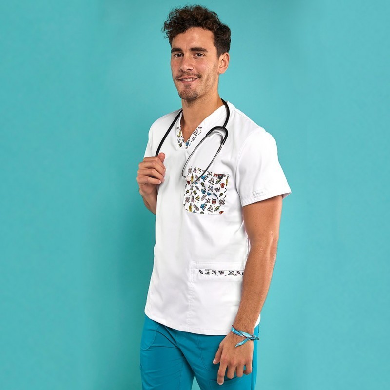 descubre esta casaca sanitaria blanca de hombre con divertidos dibujos de motivos sanitarios. Su tejido ultrasuave garantiza comodidad durante todo el día. Con exclusivos dibujos de los calzados de la marca dian, líder en calzado laboral, es ideal para profesionales que buscan estilo y originalidad en su uniforme.