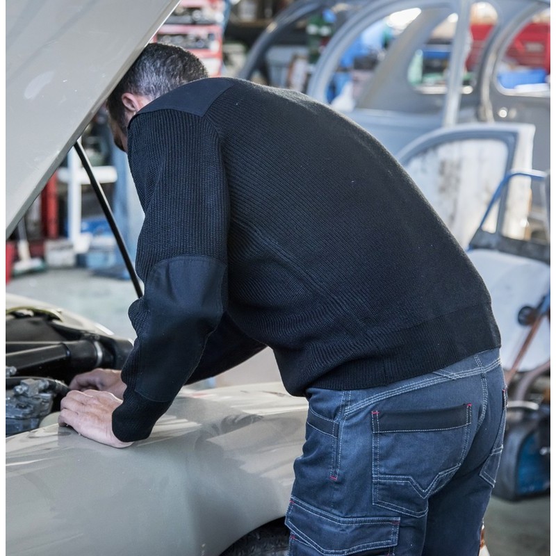 este jersey unisex de cuello caja ofrece la combinación perfecta de comodidad y durabilidad. Con refuerzos en codos y hombros, y un bolsillo en el pecho con solapa para un almacenamiento seguro, es ideal para crear un look uniforme y profesional.