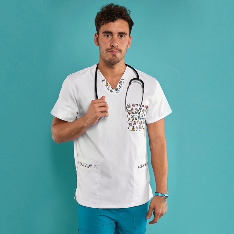 découvrez cette veste sanitaire blanche homme avec des dessins amusants de motifs sanitaires. Son tissu ultra-doux garantit confort tout au long de la journée. Avec des dessins exclusifs des chaussures de la marque dian, leader dans le chaussage professionnel, elle est idéale pour les professionnels qui recherchent style et originalité dans leur uniforme.
